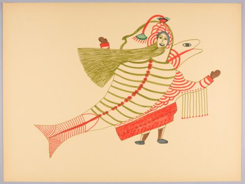Pudlo Pudlat was born in 1916 at Ilupirulik camp, and began his artistic career when he moved to Cape Dorset in the late 1950s. His artwork depicts elements of modern technology, including airplanes and helicopters, while also capturing scenes of everyday traditional life. Pudlo passed away in 1992 and left behind a body of work consisting of over 4000 drawings and 200 prints. His works are held in the collection of the National Gallery of Canada, and many other institutions across the country. Pudlo's print, Aeroplane (1976), was reproduced on a Canadian postage stamp in 1978.