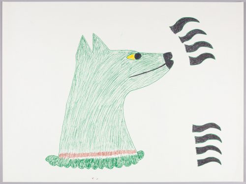 Pudlo Pudlat was born in 1916 at Ilupirulik camp, and began his artistic career when he moved to Cape Dorset in the late 1950s. His artwork depicts elements of modern technology, including airplanes and helicopters, while also capturing scenes of everyday traditional life. Pudlo passed away in 1992 and left behind a body of work consisting of over 4000 drawings and 200 prints. His works are held in the collection of the National Gallery of Canada, and many other institutions across the country. Pudlo's print, Aeroplane (1976), was reproduced on a Canadian postage stamp in 1978.